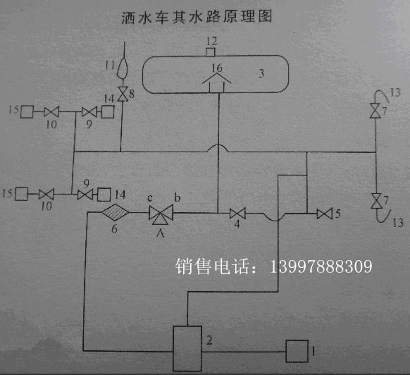 1、取力器 2、水泵 3、水罐 4、連通閥 5、消防球閥 6、過濾網(wǎng) 7、前沖閥、8、灑水炮閥 9、側(cè)噴閥 10、后灑閥 11、灑水炮 12、罐口蓋 13、前沖器、14、側(cè)噴蓮花頭 15、后灑砣 16、防旋板 ABC、三通四位閥