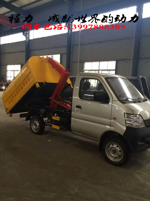 長安小勾臂垃圾車(車廂可卸式垃圾車)工作原理及結(jié)構(gòu)組成:小型長安汽油拉臂式垃圾車是在底盤上設(shè)附車架,在附車架上安放垃圾箱,并安裝吊裝裝置。拉臂主液壓缸是吊裝、卸載垃圾的主要傳動裝置,控制其伸縮可完成吊裝垃圾箱、卸垃圾以及卸下空垃圾箱的工作過程,拉臂主液壓缸一端連接在附車架的尾端靠駕駛室一端,另一端則連接在拉臂上。