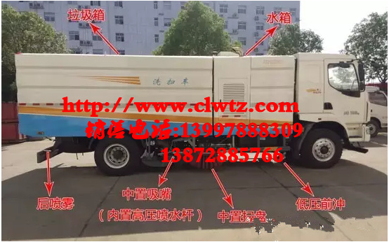 洗掃車結(jié)合了掃路車和高壓清洗車的功能,一般標(biāo)配兩個(gè)中置掃刷,中置超寬吸嘴(內(nèi)置高壓噴水桿)。洗掃車在作業(yè)時(shí)由高壓噴水桿噴出高壓水流,可沖起路面頑固附著物,由吸嘴連同水和垃圾一起吸進(jìn)垃圾箱。由于洗掃車在作業(yè)過(guò)程中耗水量較大,所以水箱比較大,因此洗掃車都由軸距在3800以上底盤(pán)改裝而成。