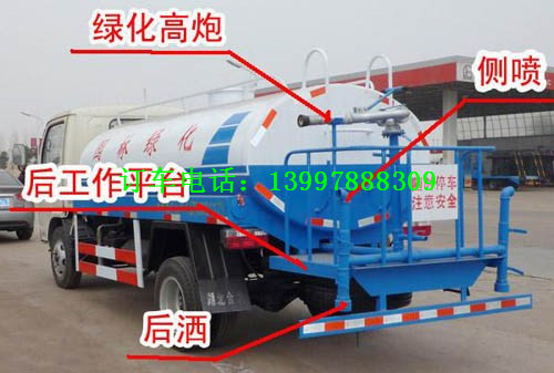多功能灑水車又稱綠化噴灑車,罐體有效容積5立方米,灑水量每平方米0.2-2升,噴槍射程最遠達24米。該車可前沖后灑,罐體后帶工作平臺,平臺上安裝綠化灑水高炮,水炮可全方位旋轉,可連續(xù)調成直沖狀、大雨、中雨、小雨模式,平臺帶安全護欄,配備專用灑水泵,泵可抽水排水,帶消防接口。該車廣泛適用于各種路面沖洗,樹木、綠化帶、草坪灌溉,道路、廠礦企業(yè)施工建設,高空建筑沖洗。具有灑水、壓塵,高、低位噴灑,農藥噴灑、護欄沖洗等功能,深受環(huán)衛(wèi)建設用戶的青睞。