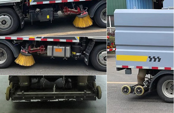 2. 工作裝置采用“中置兩盤(pán)掃+后置寬吸嘴+內(nèi)置高壓主噴桿+左右高壓側(cè)噴桿”布置形式,實(shí)現(xiàn)路面的洗掃及吸塵。